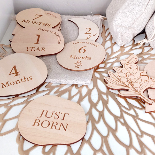 レーザー彫刻による名入れや、お子さまの出産や成長の記録を残すアート、保育資格を持つオーナーがセレクトしたアイテムなど。